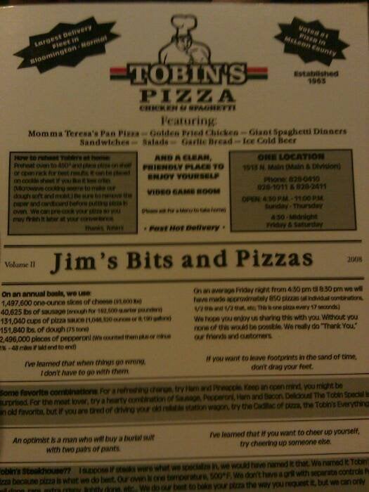 Tobin’s Pizza, located in Bloomington, IL, offers a variety of delicious Italian dishes such as spaghetti with meat sauce, meatball sandwiches, and an array of pizza options including cheese, black olive, and hot pepper. Customers rave about the crunchy crust and generous toppings on their pan pizza, with one reviewer calling it the best pizza they've had in years. The Family Buck Stretcher deal, where you can add a smaller pizza to your order at a discounted price, is a popular choice among patrons. While some may find the thin crust to be lacking in flavor, the abundance of cheese and toppings makes up for it. Overall, Tobin’s Pizza is a must-visit spot for pizza lovers in the Bloomington/Normal area, offering good service, a nostalgic 70s vibe, and tasty, value-for-money options.